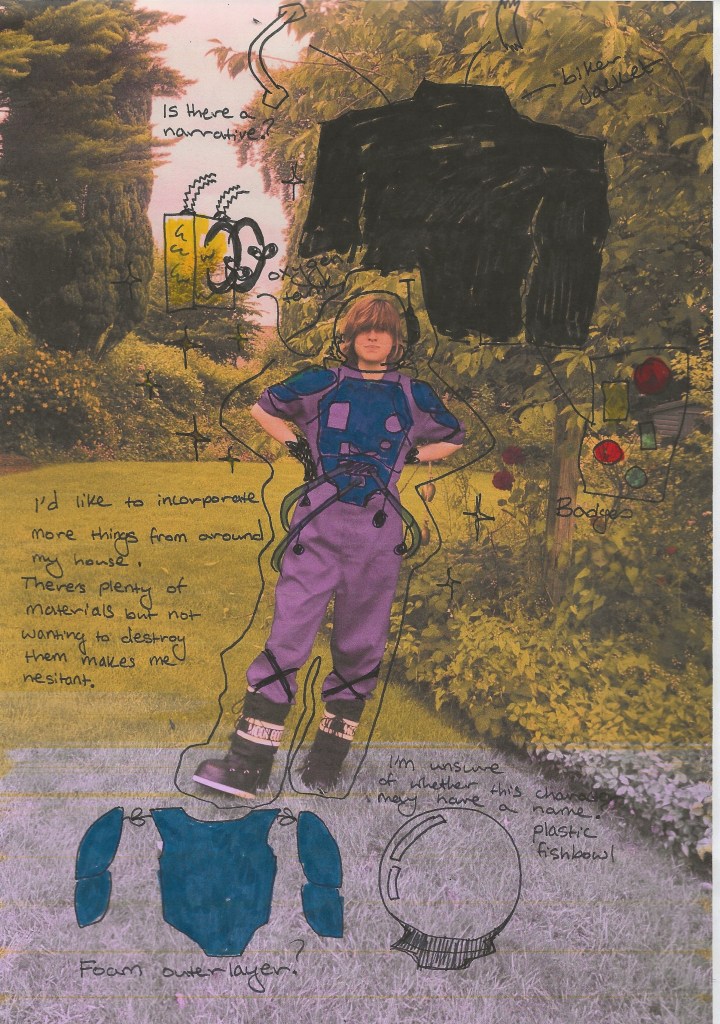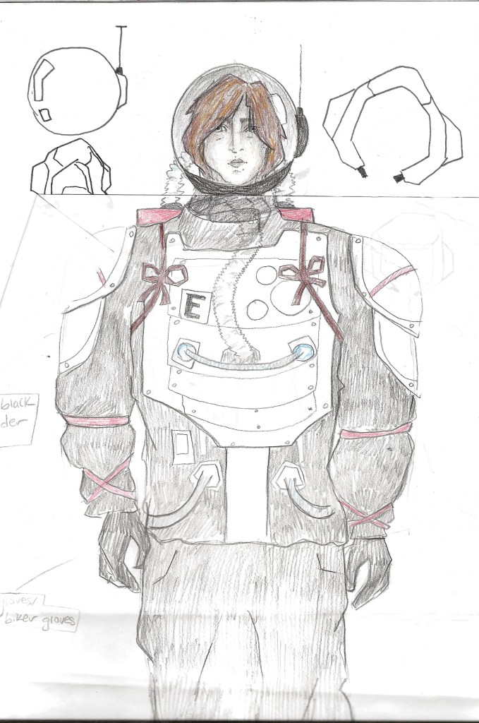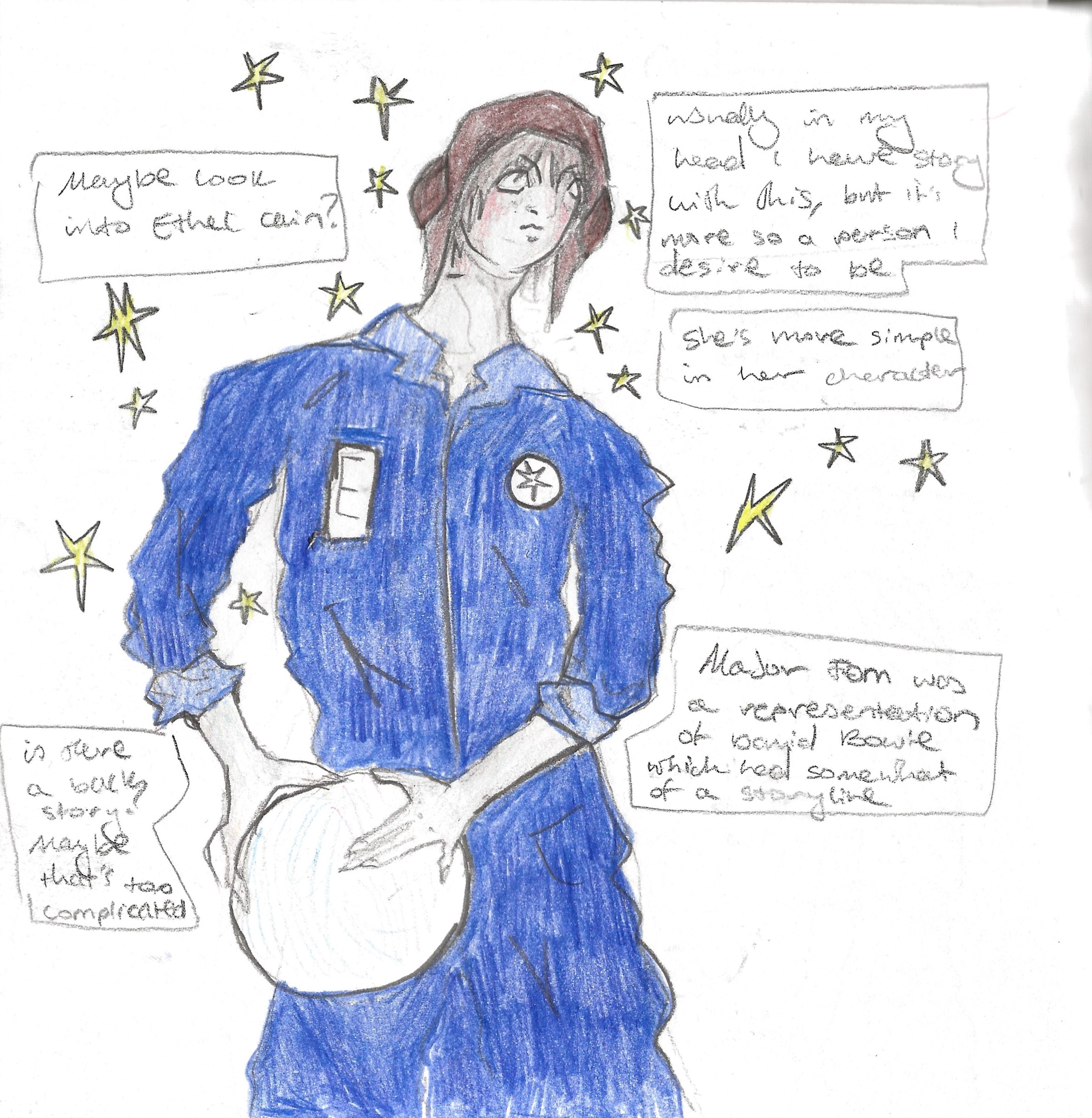 Recently I’ve been trying to gather items which I’d be able to use in making somewhat of an outfit or my idea of an astronaut in terms of how it relates with my character. In between doing this I’ve made rough sketches jotting out ideas and drawing outfit designs. Some of the images have been shown in previous posts but I’ve been able to scan them in so they’re also uploaded here as well!