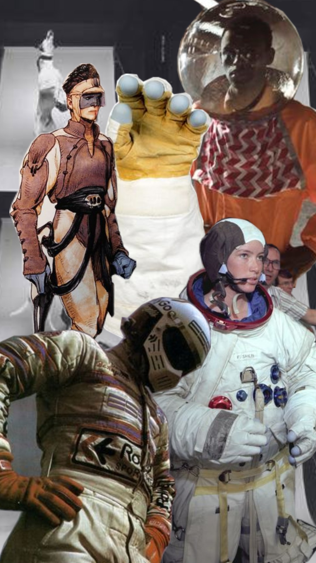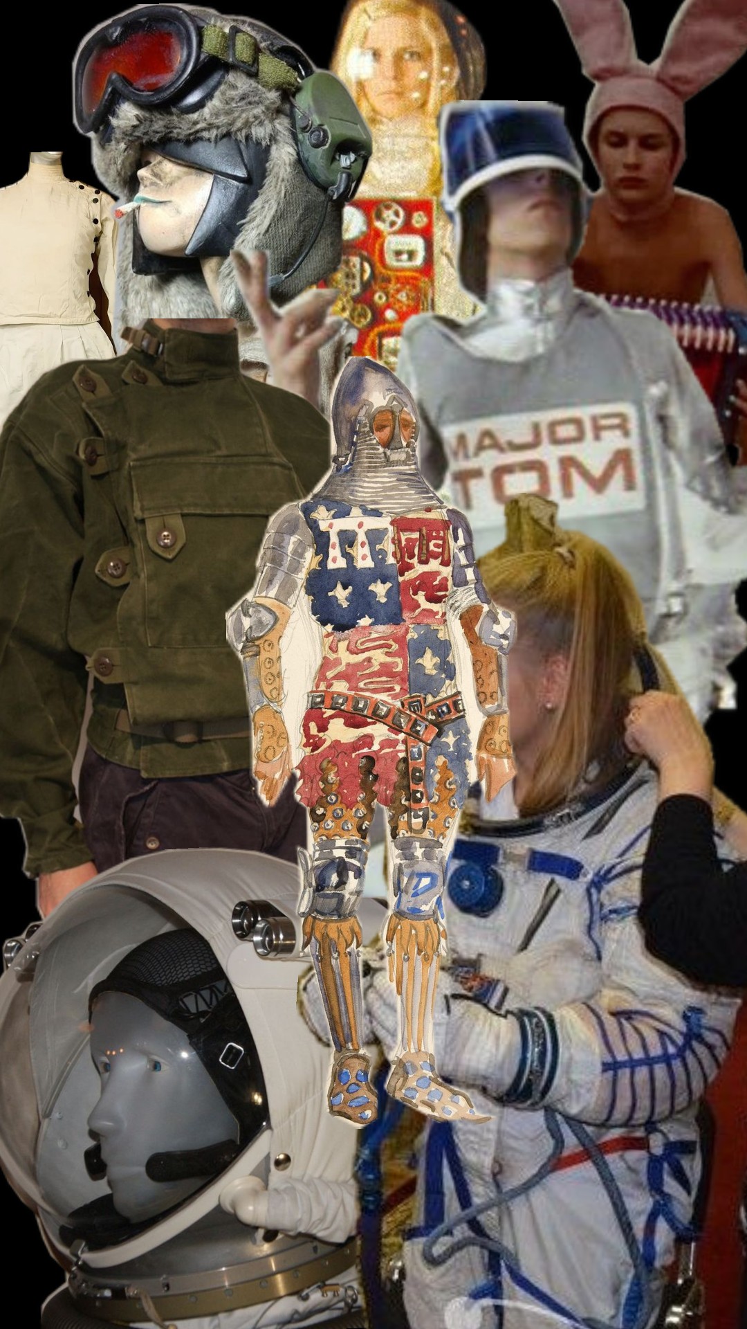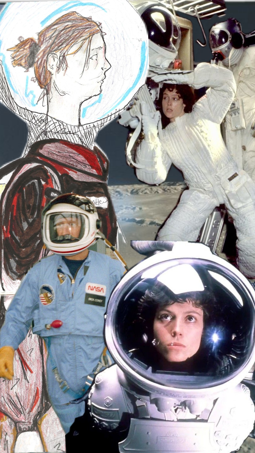 I’ve found a blue boiler suit and also have a biker jacket which is quite bulky but I quite like how padded out it is. The biker suit and boiler suit were specifically designed for men so in this way it does have the effect of making me feel more masculine. With the foam sheets I have, I’ve considered using foam sheets to create an outer piece of “armour”, kind of like what Ellen Ripley’s character wears in Alien. Her white suit is fitted with these hard shoulder pads and chest plate that connects with her helmet. But I don’t want to overcomplicate the process, the outfit can be really simple for me but still tie in with the astronaut look using tubes and other things.