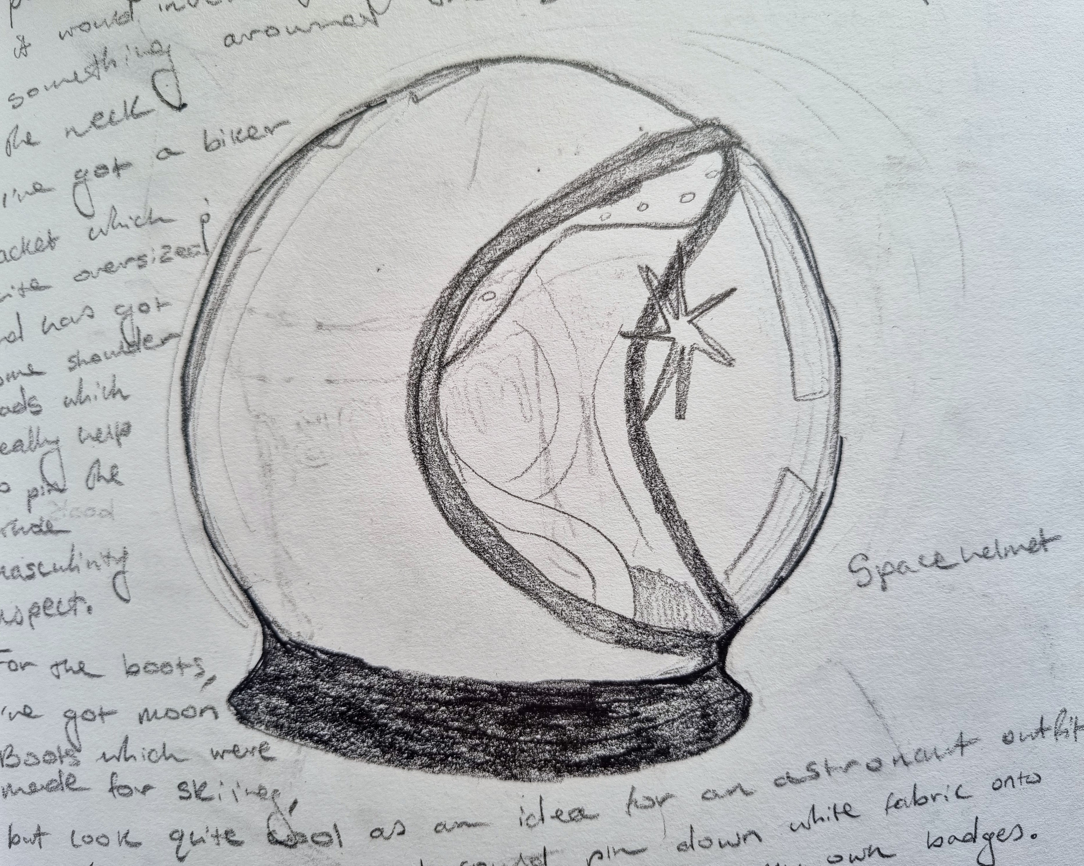 The astronaut helmet was difficult to try and put together. Originally I was just looking for a glass bowl that could fit around the head, like the helmet used in the ‘Afronauts’ series and other examples I showed from sketches and collage images. Surprisingly it’s really difficult to find a head size bowl with an opening that is also head size. I managed to find a bowl that was head size but the opening was really small. To make this larger, I broke it and used a small glass cutter. To make this safe to wear I sanded it a bit and taped around the outside of it. Using foam role and superglue, I cut out a shape which would be able to stand on my shoulders, I did this for the front and the back, I also cut out a shape that would be able to go over the top of the glass. I used a heat gun to make this foldable, and foam clay as well for some of the top part of the glass. I then painted over this with white paint and a red line. I added a couple of accessories like a hair pin to the side which acts as some sort of an antenna, I also glued on a zip from a part of a jacket on the front. Although the outcome is really messy and quite disproportionate, it managed to actually be wearable which I’ve impressed myself with since making and working in 3D is not my strong suit! I also quite like how it conceals my face when I wear it, since the subject of this is more based around identity and gender, it makes more sense for the wearer to look a bit “ambiguous”.