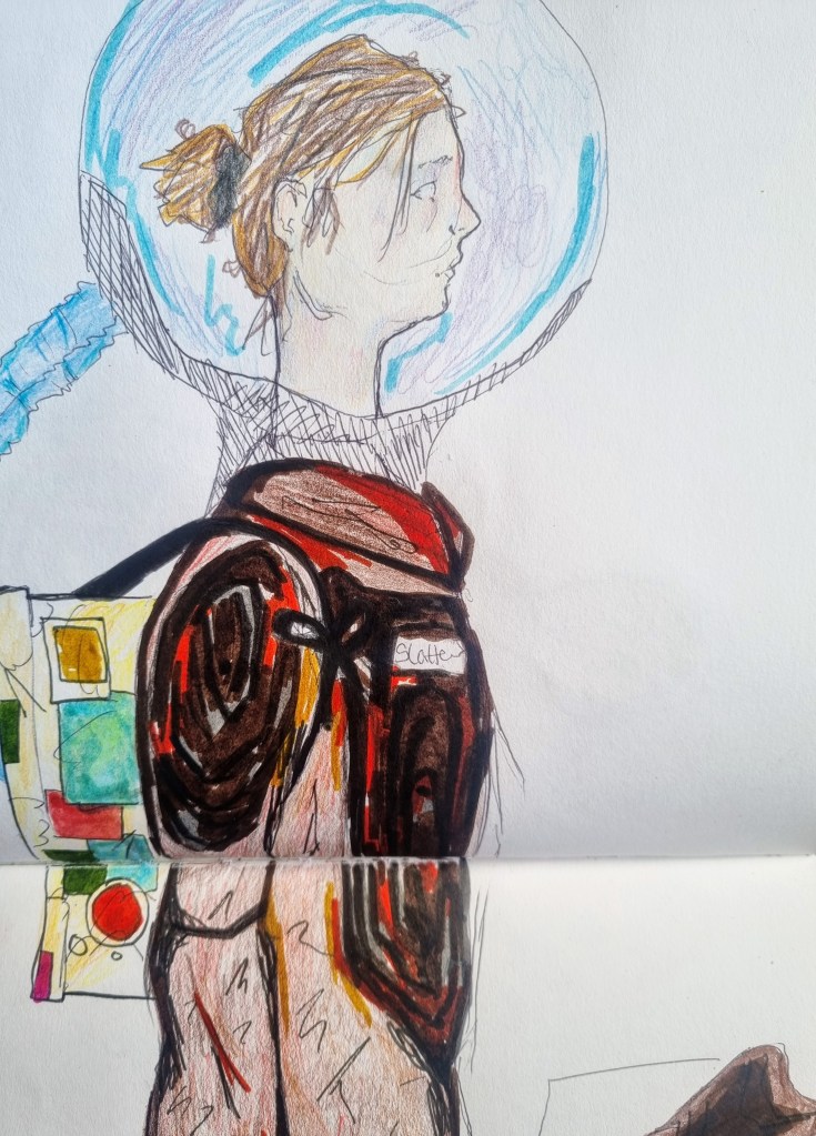 Throughout the process of focusing on this subject, it’s been challenging since it combines making things in 3D, and also having to be photographed, but because of this it’s also been super fun and one of the most experimental things I’ve done in terms of the subject and how I’m conveying this! Using the boilersuit as an astronaut’s overalls and wearing a biker jacket as the more protective gear, alongside with the helmet, was interesting in how I felt. I didn’t feel macho or masculine and I didn’t feel at all feminine either, I really only felt like an astronaut and only identified with that role, which in a way blurred the lines of gender. I drew on some makeup around the jaw cheeks for a more masc look, and in the last two images below I drew on a moustache, just since I wanted to play around more with drag. I did have the idea of wearing more of a drag get up for this, but didn’t want it to turn into a male astronaut or a drag king astronaut, I wanted it to remain in the middle. From what I said above, I wonder how it would feel to be an astronaut (as am I here) but without the bounds of Earth, and the questions surrounding gender from that experience. This reminds me of a book I’ve also been recommended by the Mission Gallery, ‘The Left Hand of Darkness’ by Ursula K. Le Guin. The premise follows an ethnologist who observes the people of planet Gethen, where the inhabitants are androgynous. The main character struggles to navigate and adapt to the Gethens unique perspectives on gender and identity. Just something I’d like to read to garner more perspective on this.