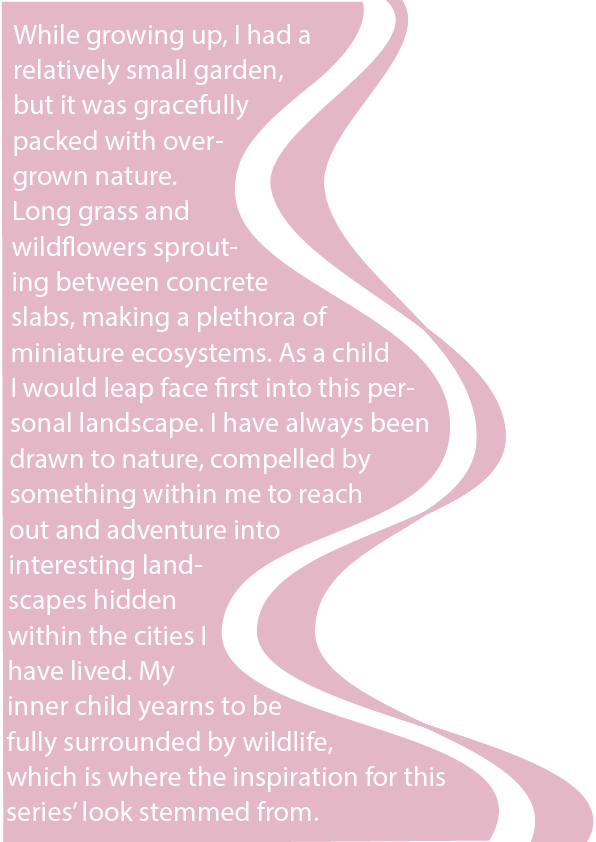 While growing up, I had a relatively small garden, but it was gracefully packed with overgrown nature. Long grass and wildflowers sprouting between concrete slabs, making a plethora of miniature ecosystems. As a child I would leap face first into this personal landscape. I have always been drawn to nature, compelled by something within me to reach out and adventure into interesting landscapes hidden within the cities I have lived. My inner child yearns to be fully surrounded by wildlife, which is where the inspiration for this series’ look stemmed from.