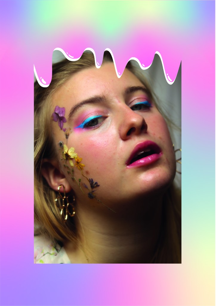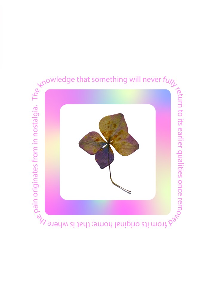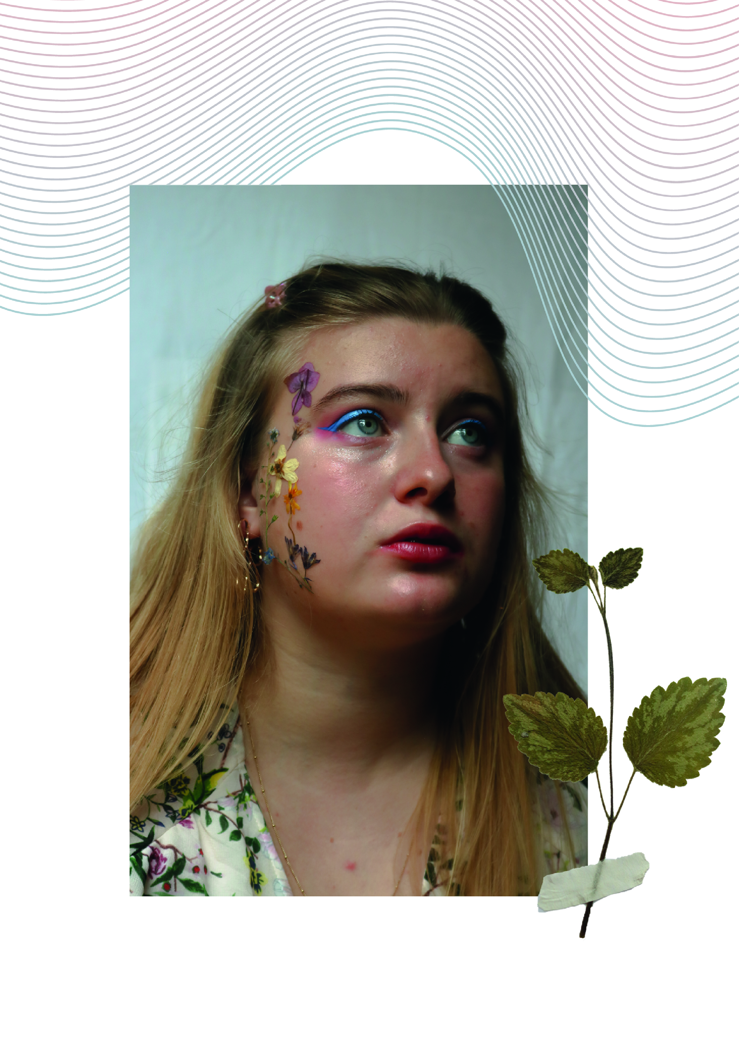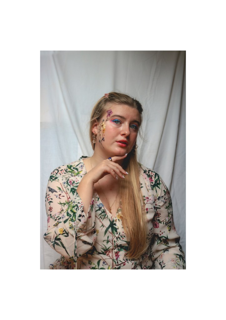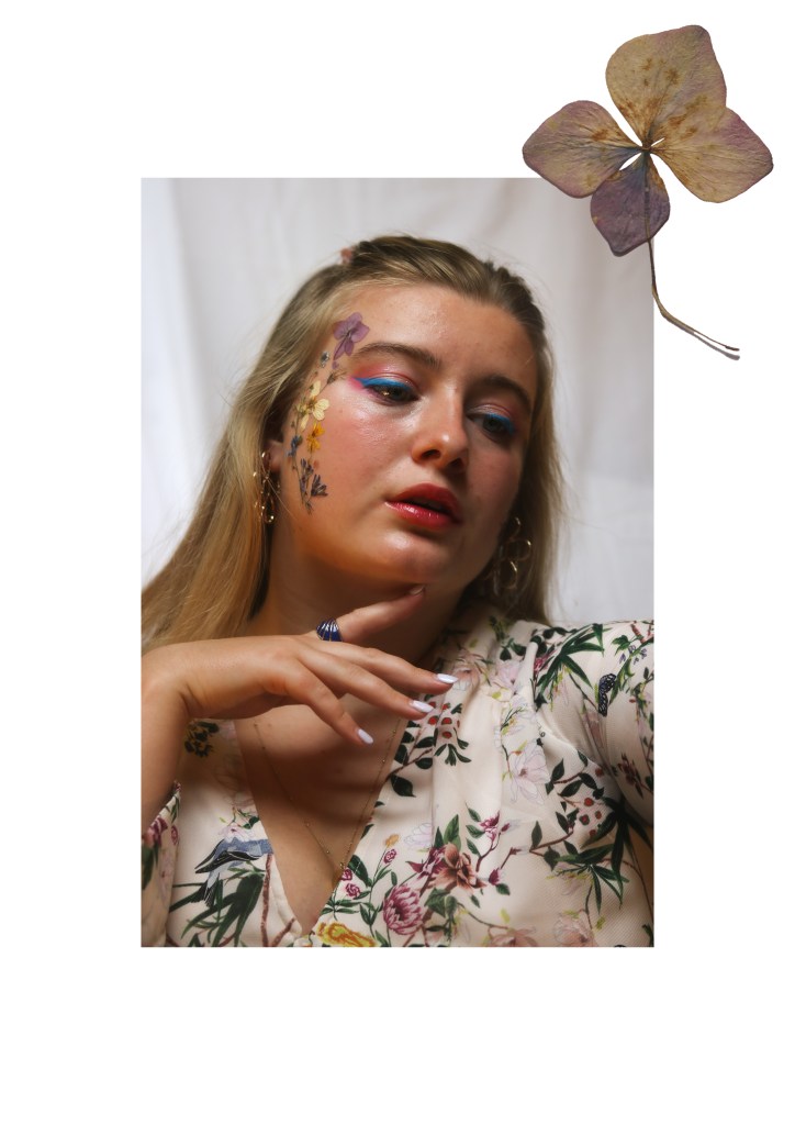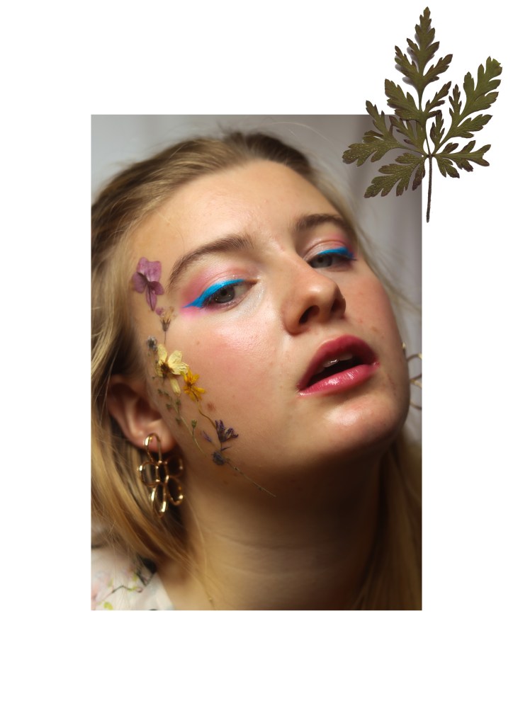 The makeup, modelling and photography was all done by me, allowing me to have complete creative control over the outcomes. The dried flowers I have displayed on my face were picked from my garden and pressed by myself. The flowers are still aesthetically beautiful and delicate but will eventually become completely stale and lifeless. The knowledge that something will never fully return to its earlier qualities once removed from its original home; that is where the pain originates from in nostalgia.